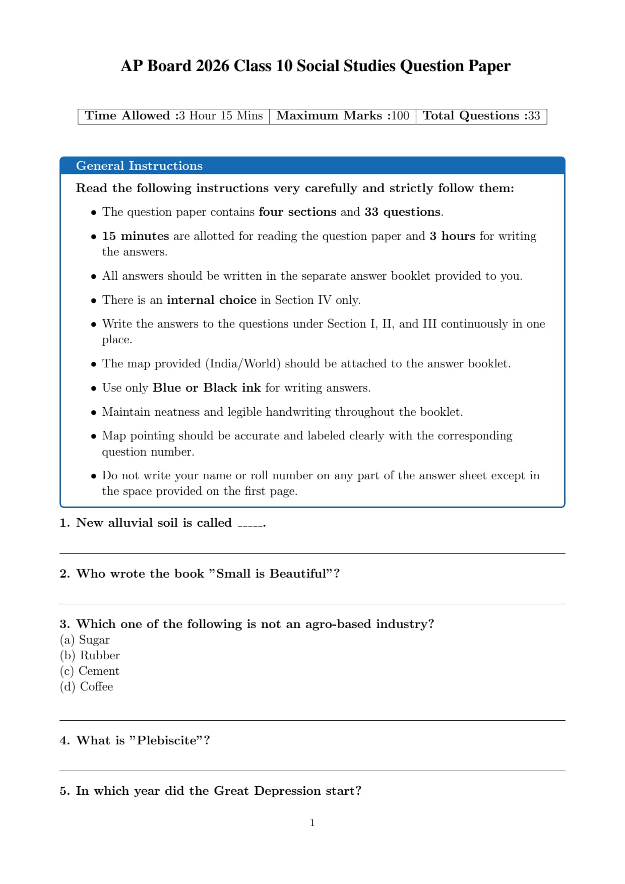 The Andhra Pradesh Board Class 10 Social Science paper covers 4 sections namely History, Geography, Civics, and Economics. The exam is conducted as part of the SSC Public Examinations and evaluates students’ knowledge of social and political systems.