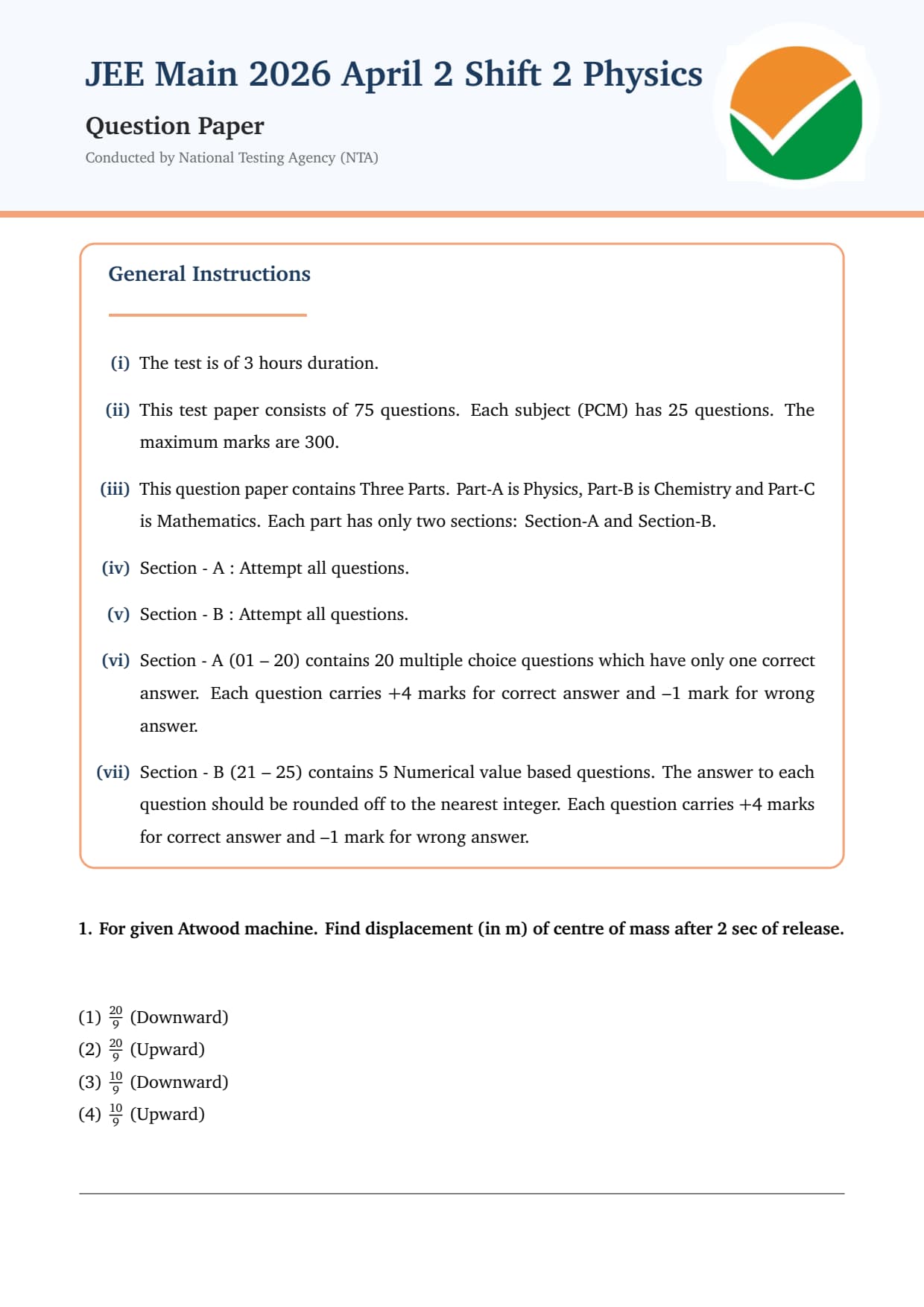 JEE Main 2026 April 2 Shift 2 physics question paper is available here with answer key and solutions. NTA conducted the second shift of the day on April 2, 2026, from 3:00 PM to 6:00 PM.