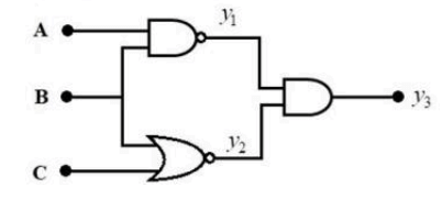 Three logic gates are connected as shown in the figure. If the inputs are A=1, B=0 and C=1, then the values of \(y_1, y_2\) and \(y_3\) respectively are