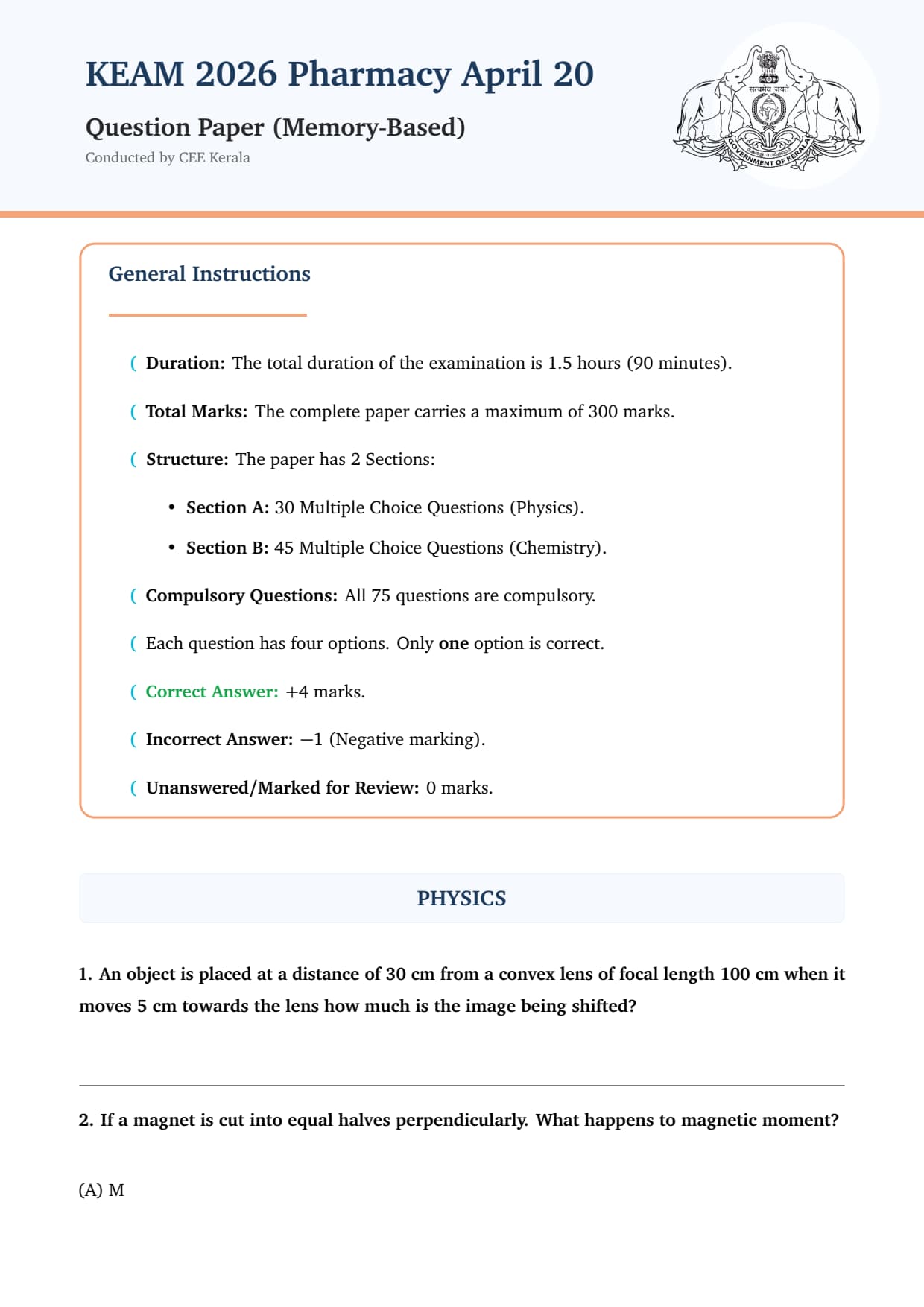 - The KEAM Pharmacy exam is divided into 2 subjects- Physics (30 questions) and Chemistry (45 questions).