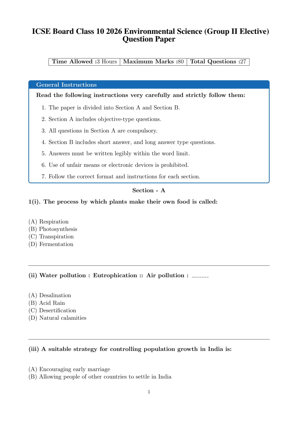 | ICSE Class 10 Environmental Science (Group II Elective) Question Paper 2026 | Download PDF | Check Solution |