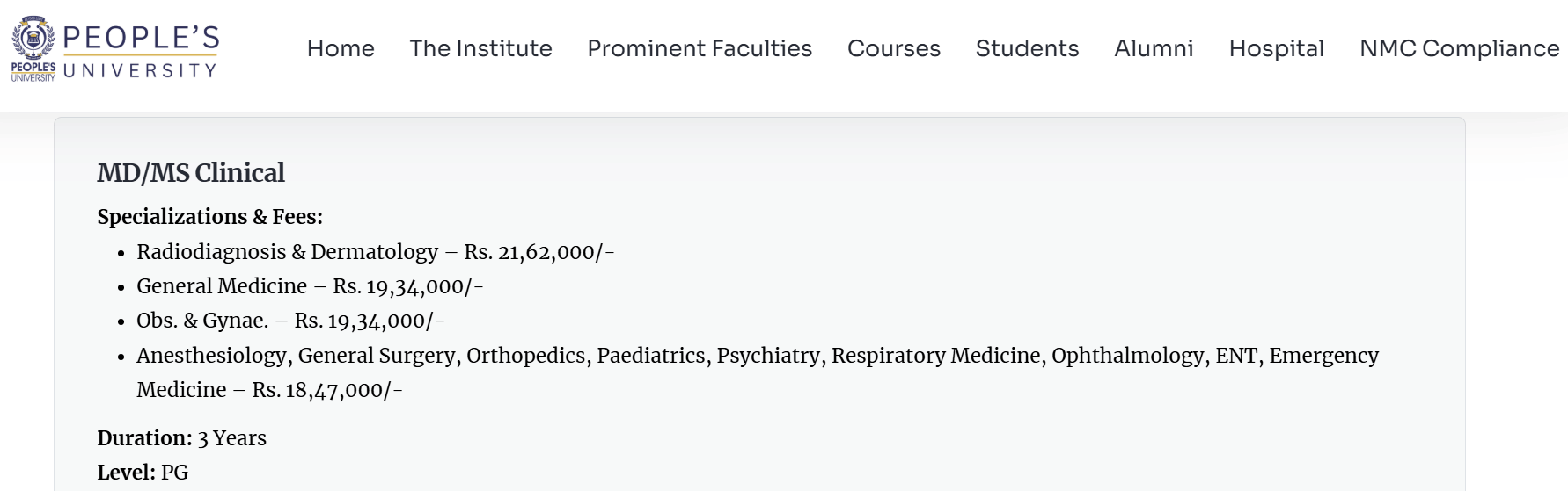 Earlier, M.S Obstetrics & Gynaecology fees at People's College of Medical Sciences & Research Centre Bhopal was ₹ 57.15 Lakhs (in 2024) for the entire course duration. This shows a fee increase of ₹ 87,000 over the year.