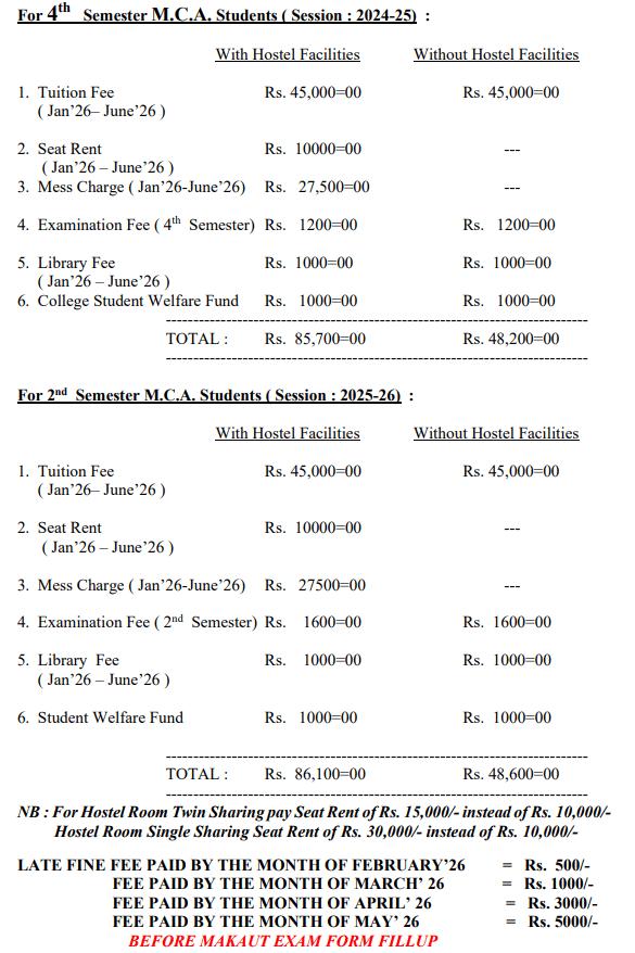 Eligible students can participate in campus placements from the fifth semester, with final year internships available. Despite economic challenges, the average package remains 4.5 LPA, particularly benefiting CS, IT, and ECE students. The college does not offer scholarships or education loans, being a private institution, and a student’s application for a state scholarship was unsuccessful. The MCA program fees for 2023-2025 are 61,500 INR for the first semester, 43,200 INR for the second and third semesters, and about 46,000 INR for the fourth semester, which includes an internship.