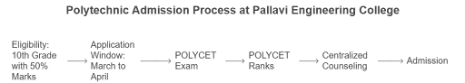 Pallavi Engineering College offers a 3-year full-time Diploma in various Engineering courses like Electricalation Engineering, Electronic Engineering, Civil Engineering, Computer Engineering, and Mechanical Engineering. Candidates must have completed 10th grade of school and obtain minimum 50% marks. Candidates need to qualify POLYCET (Polytechnic Common Entrance Test).