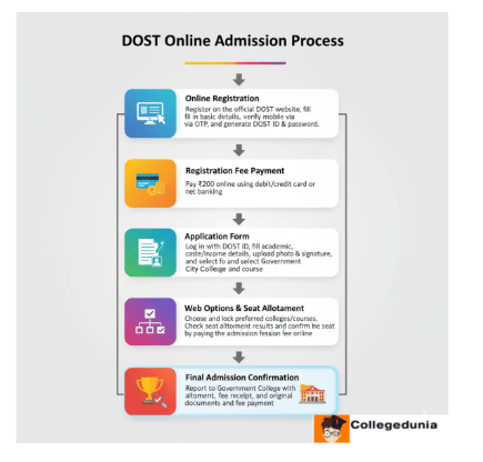 | UG | Cleared 10+2 (Science for B.Sc; Commerce/any stream for B.Com/B.A.) from recognized board | Apply via DOST portal → Pay INR 200 (registration) + INR 100 (application) → Seat allotment based on merit and reservation → Pay admission fees online → Verification at college with original documents |