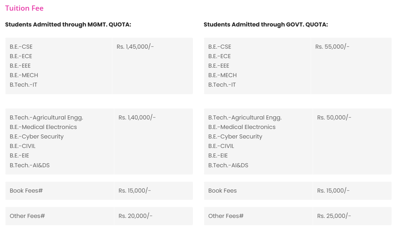 1,65,000 per year, with additional fees for exams and breakage. Hostel fees are about Rs. 1,20,000 annually. Scholarships such as the First-Generation Graduate Scholarship reduce fees by Rs. 25,000 yearly, with other scholarships available based on merit and need. Government quota students pay Rs. 8,000 per annum, while management quota fees approximate Rs. 1.5 lakhs annually. The competitive fee structure remains stable after admission, ensuring robust placement support and opportunities for high stipends.
