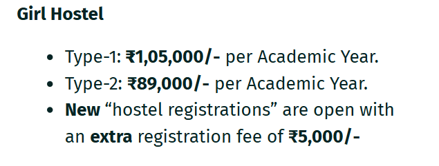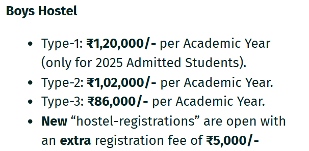 The hostel at B.V. Raju Institute of Technology offers a variety of facilities for students with a capacity for 1000 students. Separate hostels are available for boys and girls, with rooms typically shared by 4 to 6 people, depending on the block. Hostel fees range from approximately Rs. 60,000 to Rs. 95,000 per year, including meals, with additional charges for air-conditioned rooms.