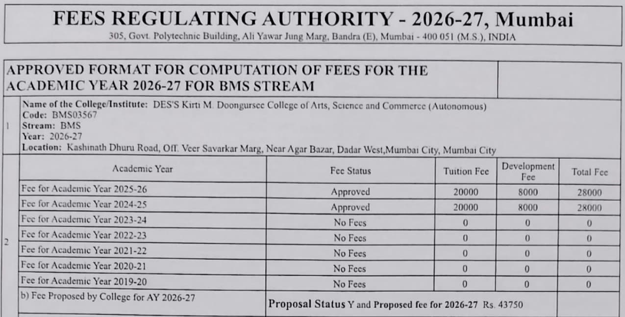 Kirti M. Doongursee College offers a supportive and practical learning environment with a faculty of 15 teachers and 5 staff members. The college emphasizes personal attention and relevant curriculum, preparing students effectively for future challenges. Students in the Bachelor of Management Studies (BMS) program pay Rs 25,000 for the first year and Rs 26,000 for the second year, with reduced fees for SC/ST students at Rs 9,000 and Rs 8,000, respectively. The college supports visually impaired students with scholarships like those from the Help the Blind Foundation.