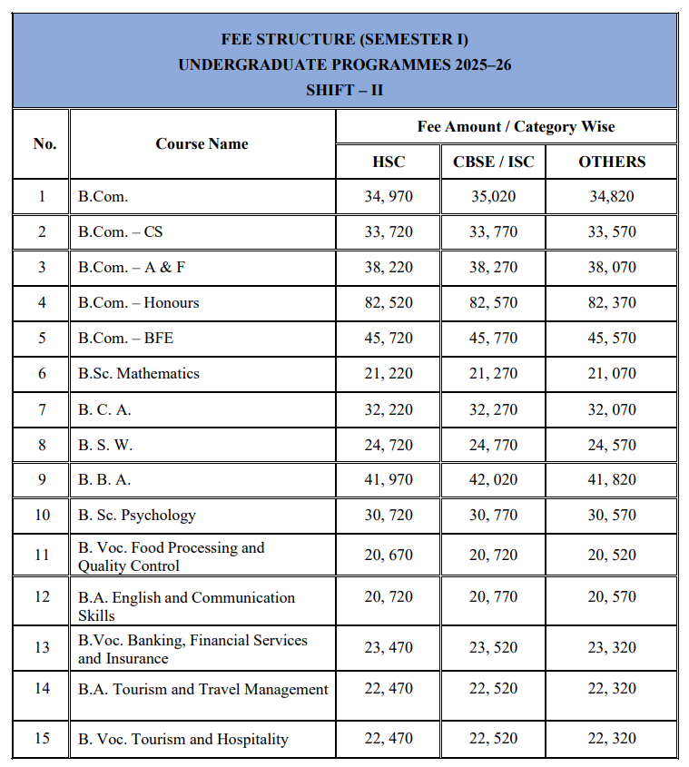 Semester fees are structured with the first and odd semesters costing about 25,000 rupees each, and even semesters slightly less, between 17,000 to 18,000 rupees. Admission requires a minimum of 50% in class 12th, with selection on a first-come, first-served basis, and no recommendations are considered.
