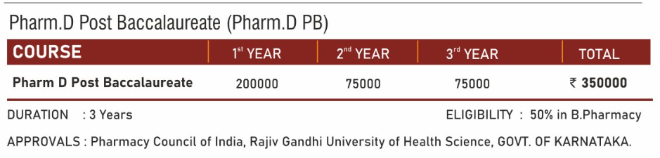 The minimum eligibility for admission to Pharm.D (PB) at RRGOI is B.PHARMA with 50%.