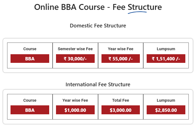 Earlier, BBA fees at Manav Rachna Centre for Distance and Online Education Faridabad was ₹ 1.65 Lakhs (in 2025) for the entire course duration. This shows that the fee has remained unchanged since 2025.