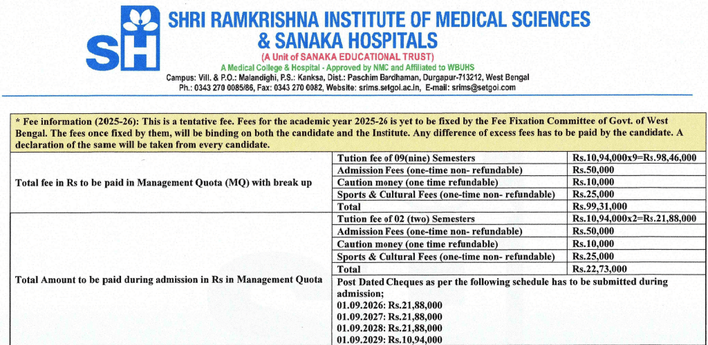 Shri Ramkrishna Institute of Medical Sciences and Sanaka Hospitals Durgapur Hostel Fee is ₹ 11.7 Lakhs to 19.5 Lakhs.