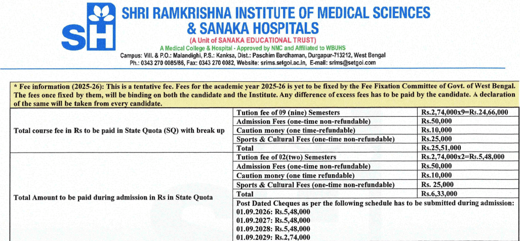 The minimum eligibility for admission to MBBS at Shri Ramkrishna Institute of Medical Sciences and Sanaka Hospitals Durgapur is 10+2+NEET UG. Candidates are allotted seats based on West-Bengal-NEET-Counselling.