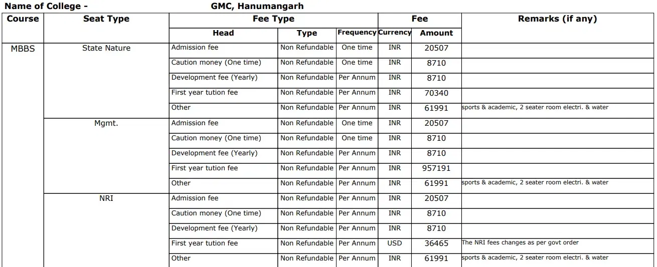 The MBBS program at GMC, Hanumangarh offers State Nature, Management, and NRI seat categories. For State Nature seats, a candidate must pay a non-refundable admission fee of INR 20,507 (one time), a non-refundable caution money of INR 8,710 (one time), a yearly non-refundable development fee of INR 8,710, a first-year tuition fee of INR 70,340 per annum, and an annual fee of INR 61,991 covering sports, academics, and two-seater room electricity & water charges. In the Management category, the structure remains the same except the first-year tuition fee is INR 957,191 per annum, along with the INR 61,991 annual fee. The NRI seats follow a similar fee pattern, with the first-year tuition fee being USD 36,465 per annum, and an annual fee of INR 61,991 covering sports, academics, and two-seater room electricity & water charges. All fees are non-refundable, and candidates should be aware that the NRI fees are subject to change as per government orders.