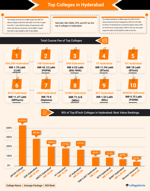 - Fees: The average course fee for an MBA ranges from INR 70 K (Nizam College, Hyderabad) to INR 38.67 lakh (ISB Hyderabad). For B.Tech, it ranges from INR 2.1 Lakh (JNTUH College of Engineering) to INR 28.85 Lakh (Woxsen University). And for MBBS, it ranges from INR 2.4 lakh (AIMSR Hyderabad) to INR 75 lakh (NIMS Hyderabad).