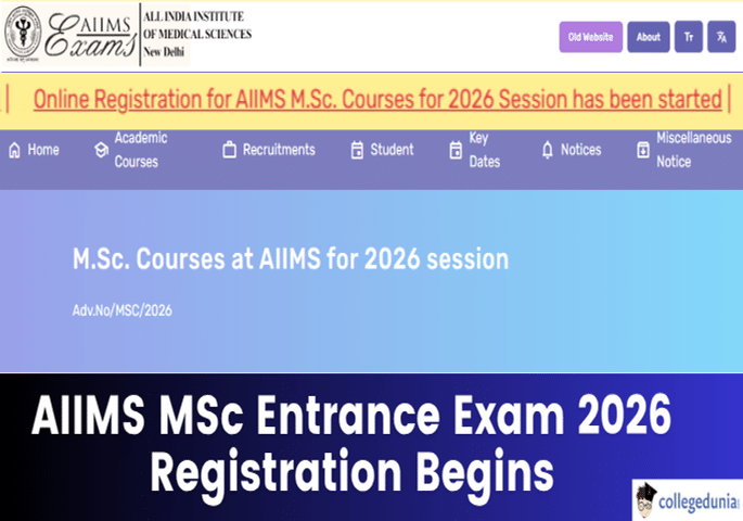 AIIMS MSc Entrance Exam 2026 Registration Begins; Apply by April 24 @aiimsexams.ac.inThe All India Institute of Medical Sciences (AIIMS) has commenced the online registration process fo...Read More Mar 30, 2026