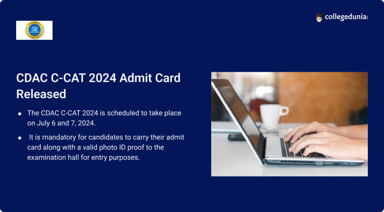 You will need to login through your application number and password to download the C-CAT 2024 admit card. The CDAC C-CAT 2024 is scheduled to take place on July 6 and 7, 2024. It is mandatory for candidates to carry their admit card along with a valid photo ID proof to the examination hall for entry purposes.