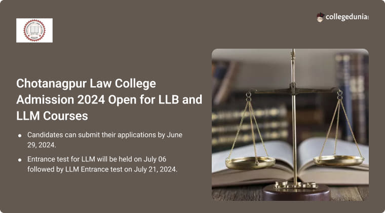 Chotanagpur Law College LLB, LLM Admission 2024 is open till June 29, 2024. Candidates can apply by submitting their applications at cnlawcollege.ac.in. The entrance test for LLB will be held on July 06 followed by LLM Entrance test on July 21, 2024.