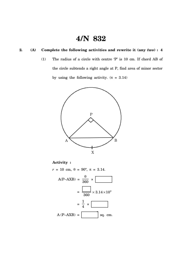 (1) The radius of a circle with centre 'P' is 10 cm. If chord AB of the circle subtends a right angle at P, find area of minor sector by using the following activity. (\(\pi = 3.14\))