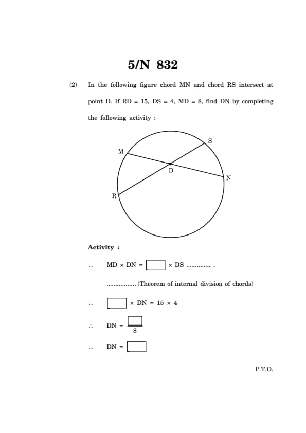 In the following figure chord MN and chord RS intersect at point D. If RD = 15, DS = 4, MD = 8, find DN by completing the following activity: