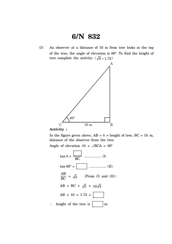 An observer at a distance of 10 m from tree looks at the top of the tree, the angle of elevation is 60\(^\circ\). To find the height of tree complete the activity. (\(\sqrt{3} = 1.73\))
