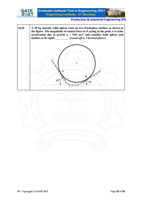 A 30 kg smooth, solid sphere rests on two frictionless inclines as shown in the figure. The magnitude of contact force in N acting at the point A is (take acceleration due to gravity \( g = 9.81 \, m/s^2 \) and consider both sphere and inclines to be rigid) ________.