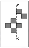 Symmetry in this case means that for each square on one side of the line P-Q, there must be a corresponding square on the opposite side. In this case, the figure is asymmetric along the line P-Q, which means that squares are missing on one side of the line.