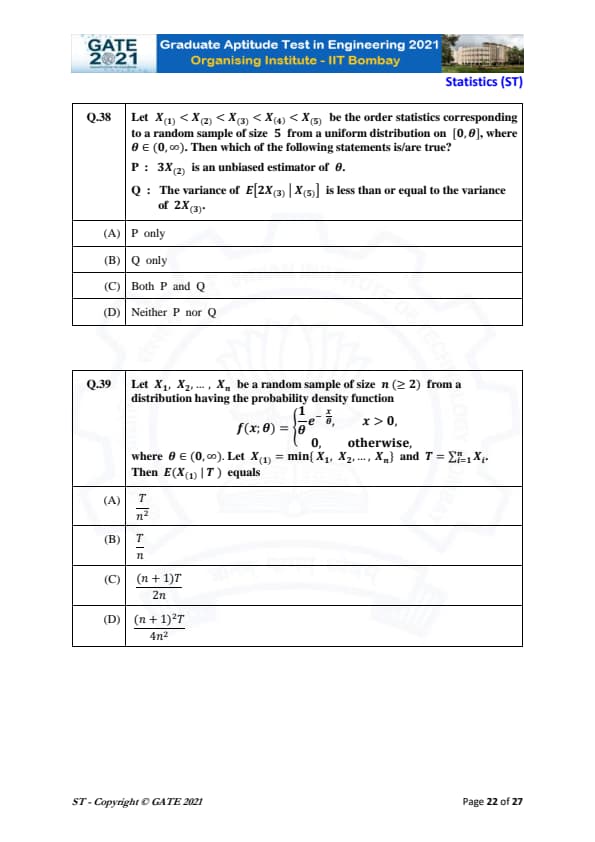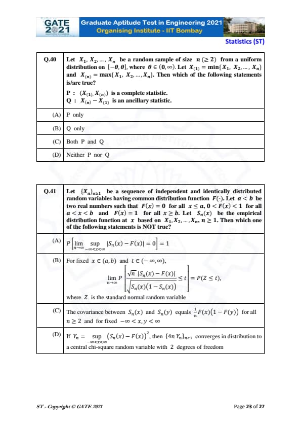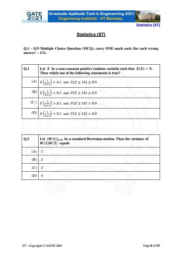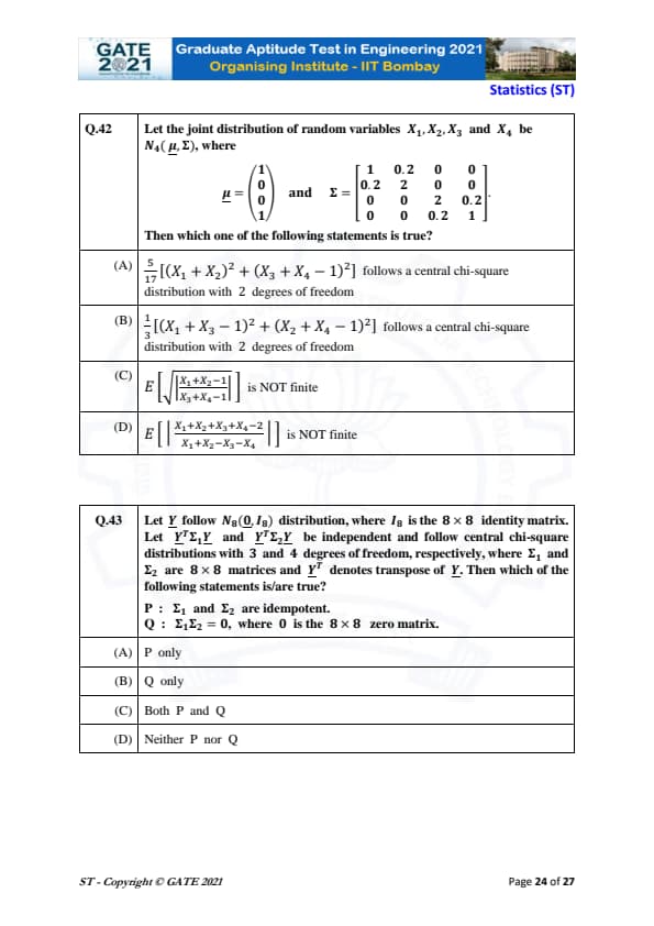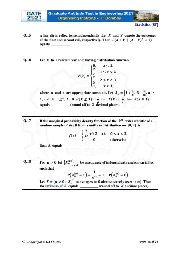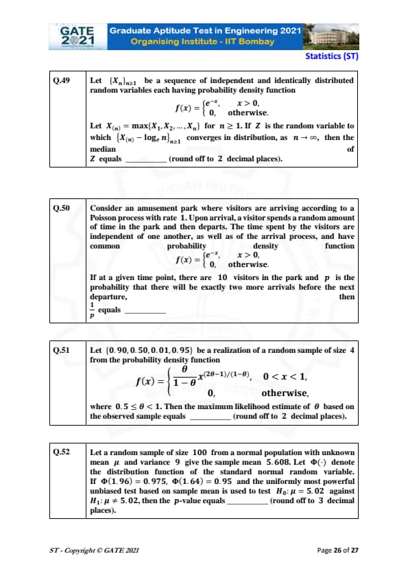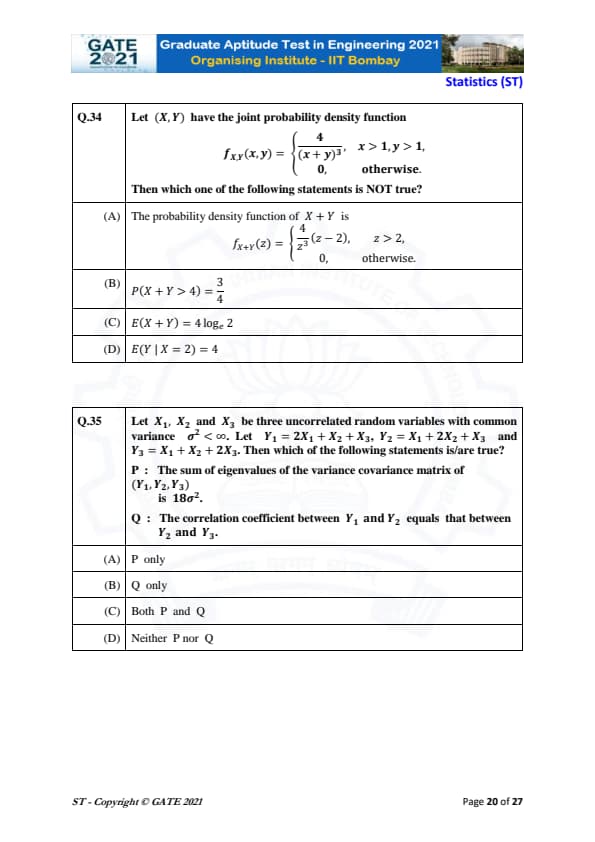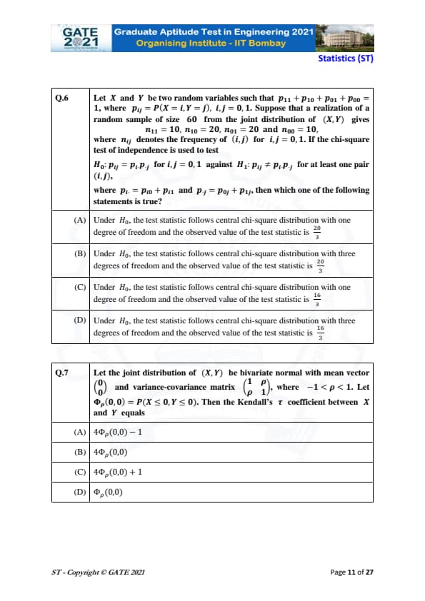 | GATE 2021 Statistics (ST) Question Paper | Check Solutions |