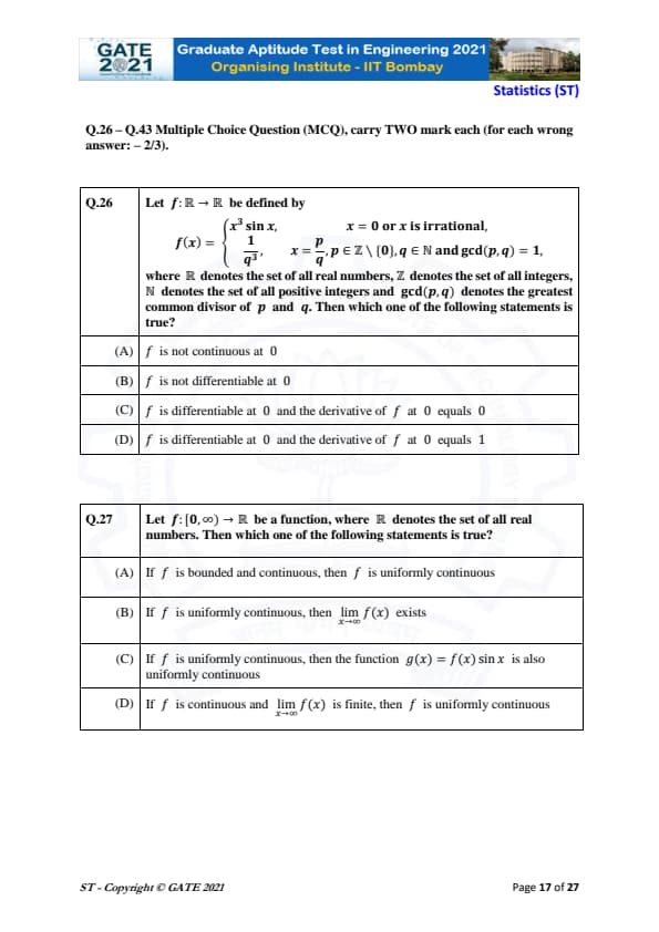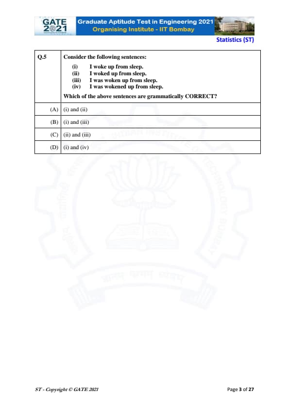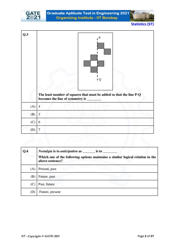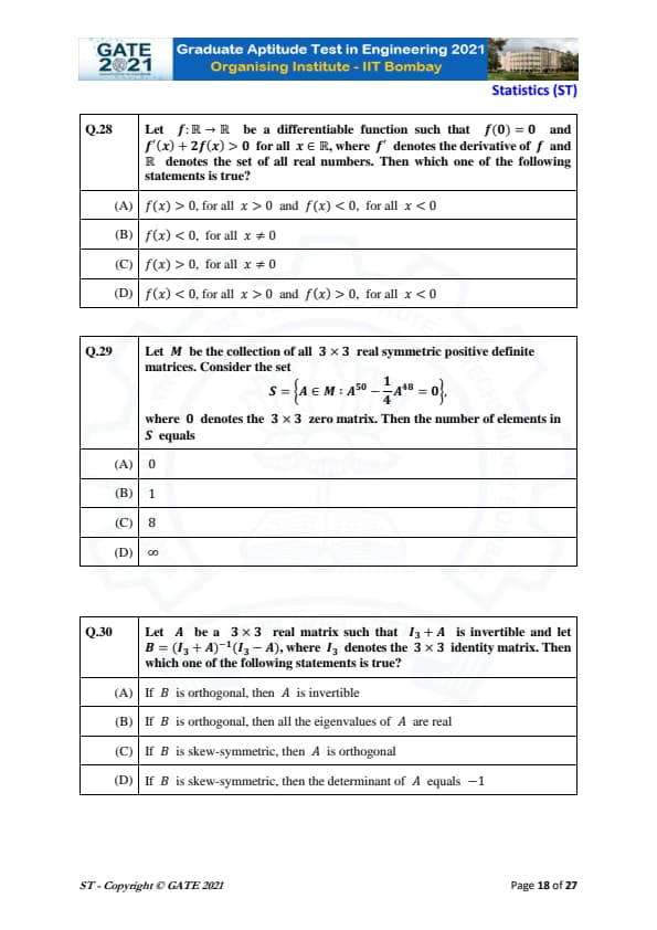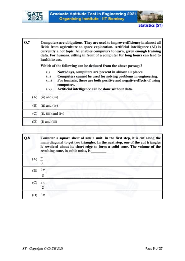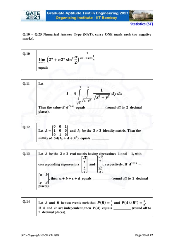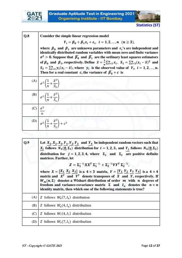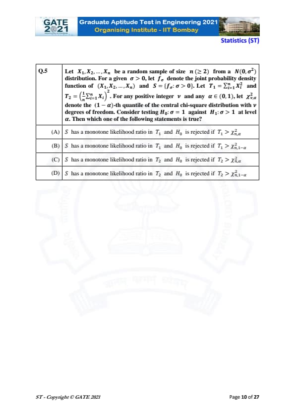 | GATE 2021 Statistics (ST) Question Paper | Check Solutions |