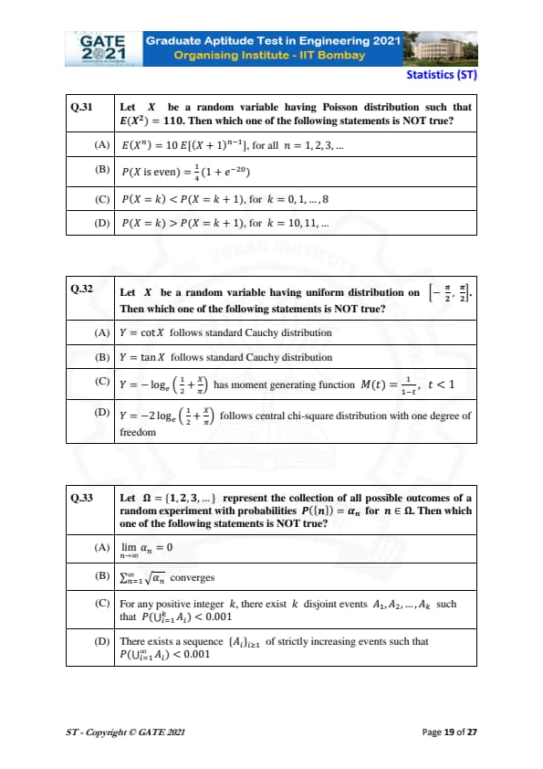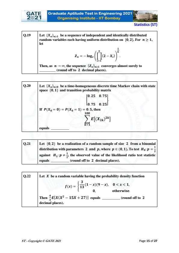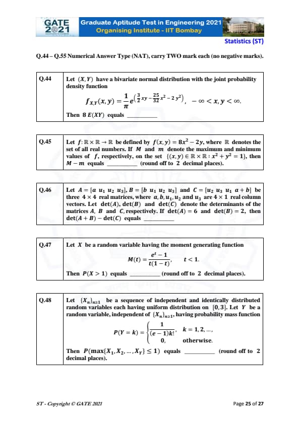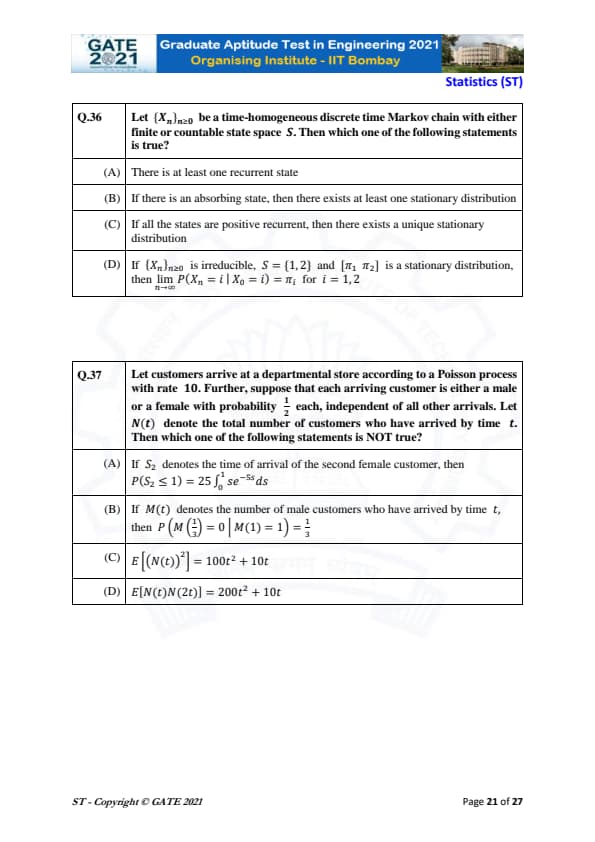 GATE 2021 Statistics (ST) Question Paper with Solutions