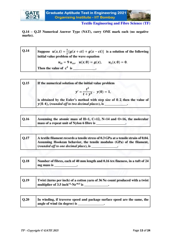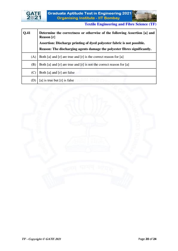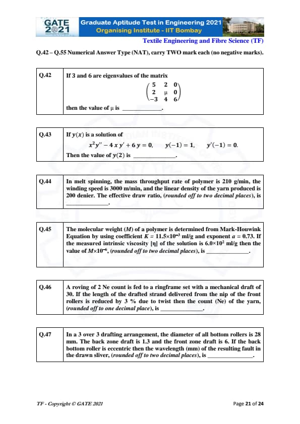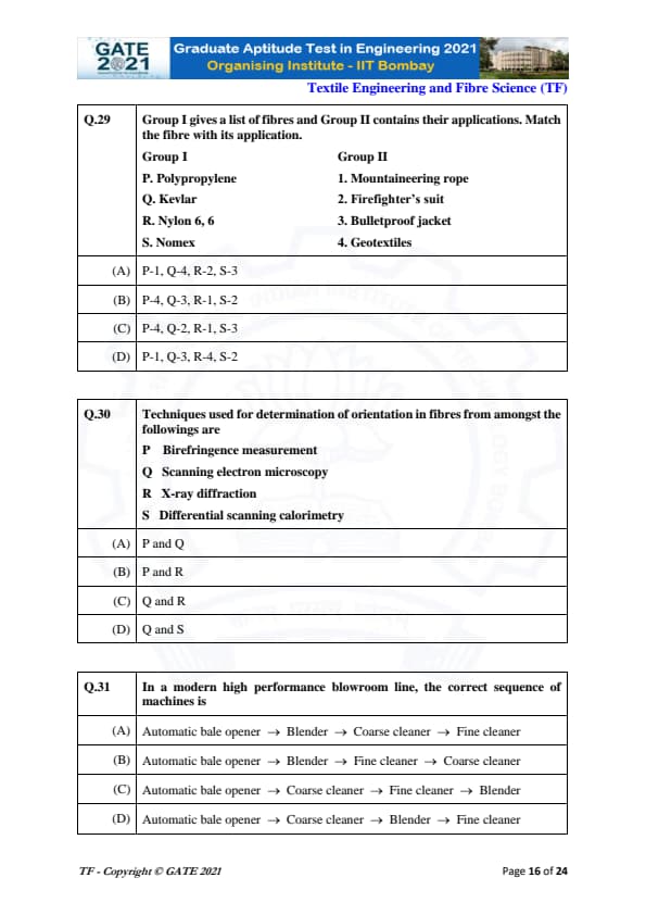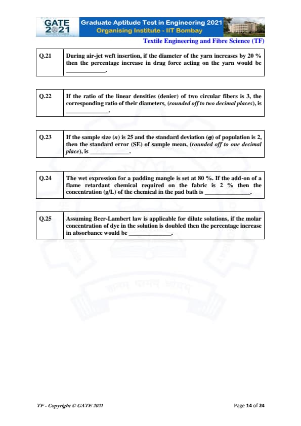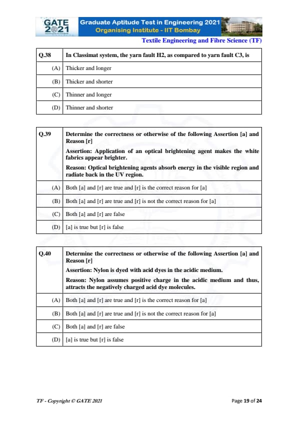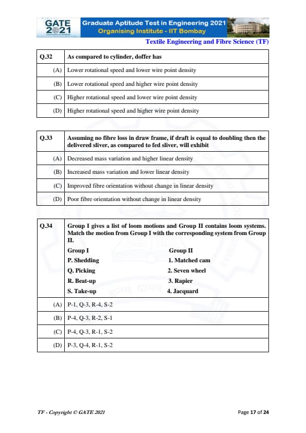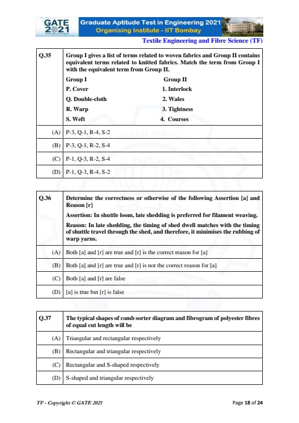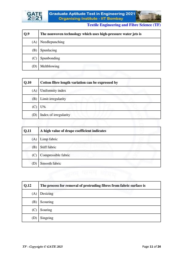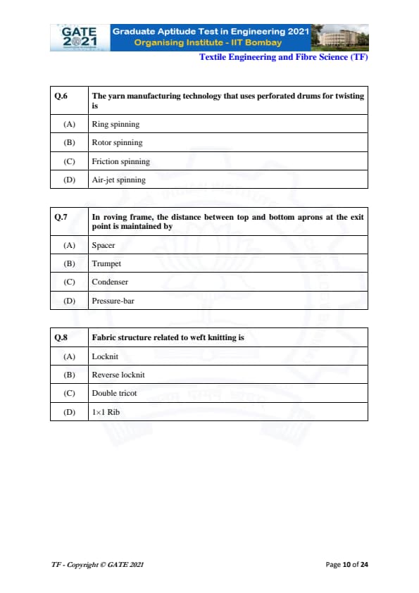 | GATE 2021 Textile Engineering and Fiber Science (TF) Question Paper | Check Solutions |