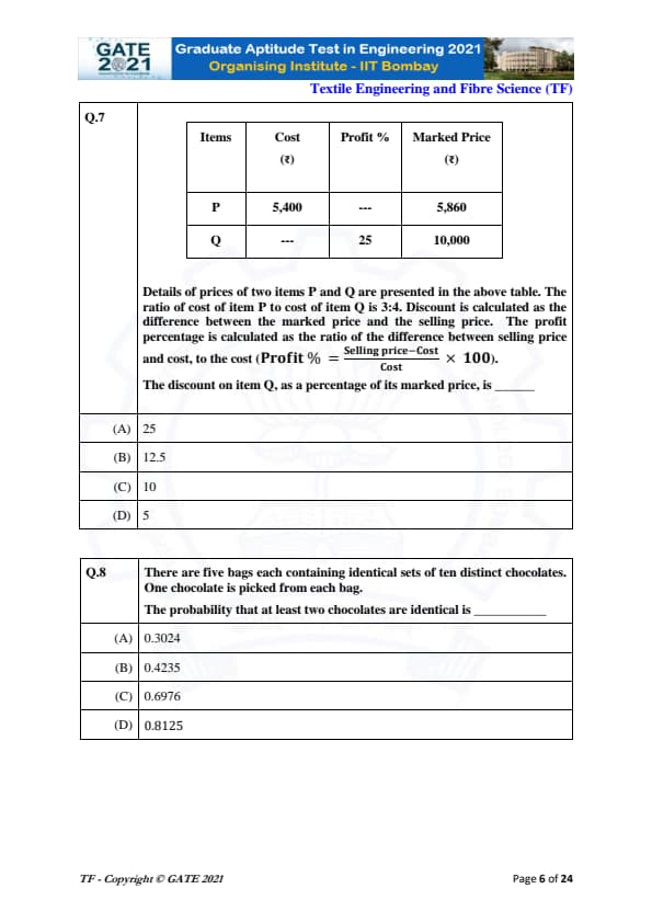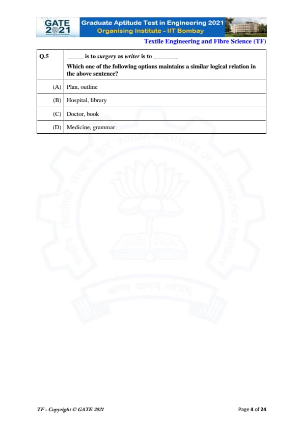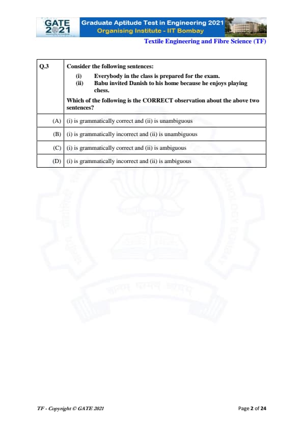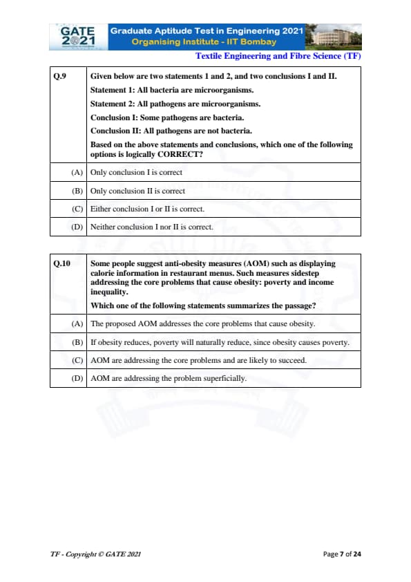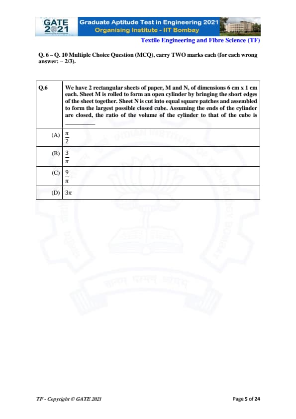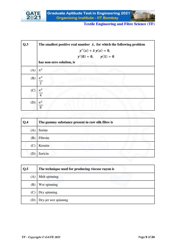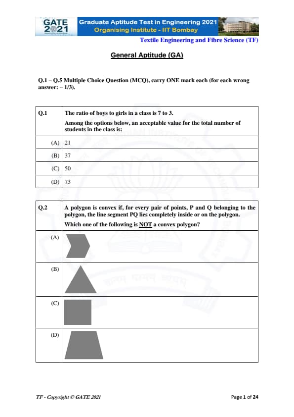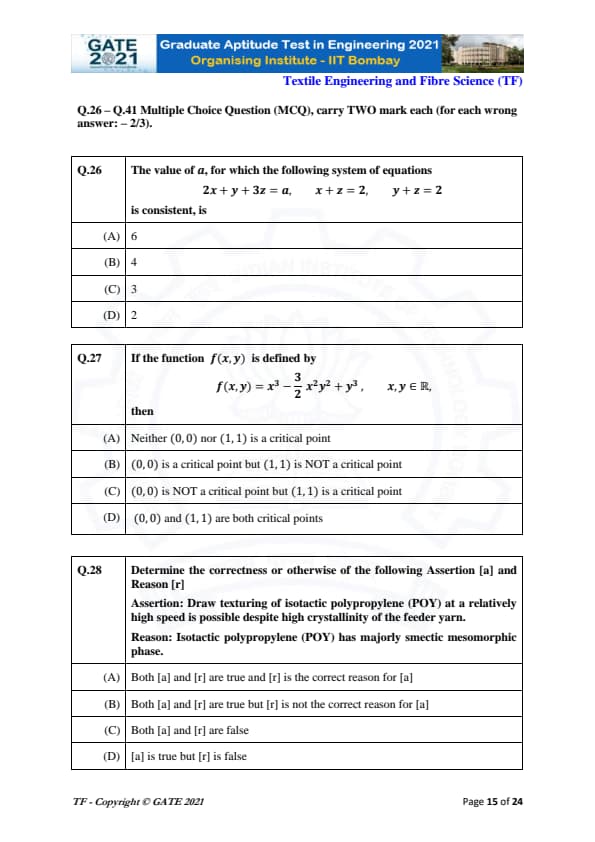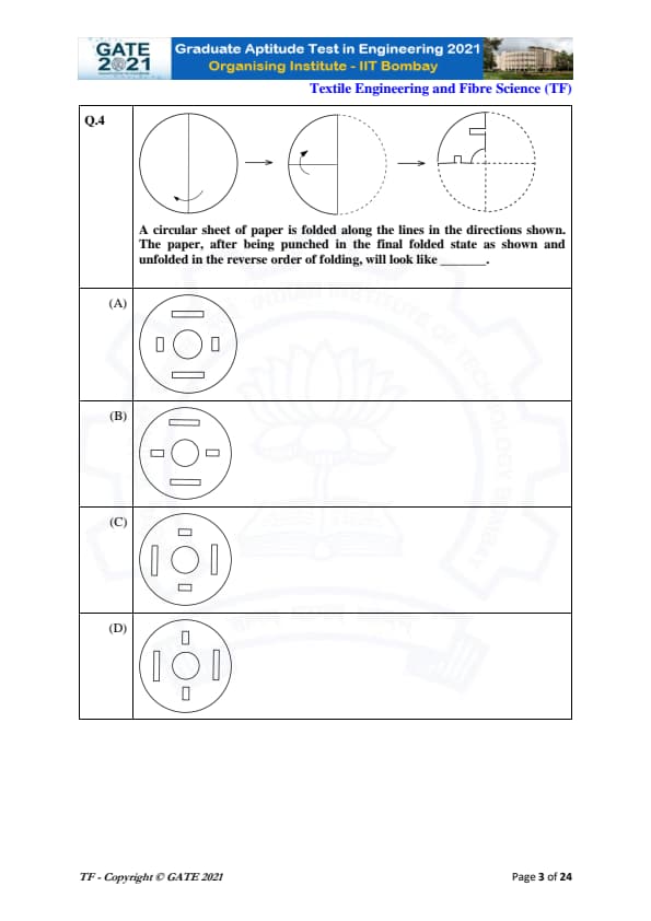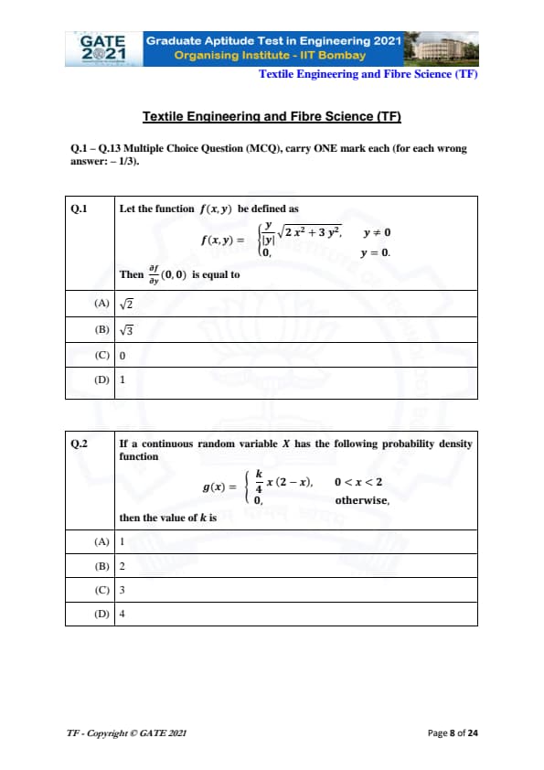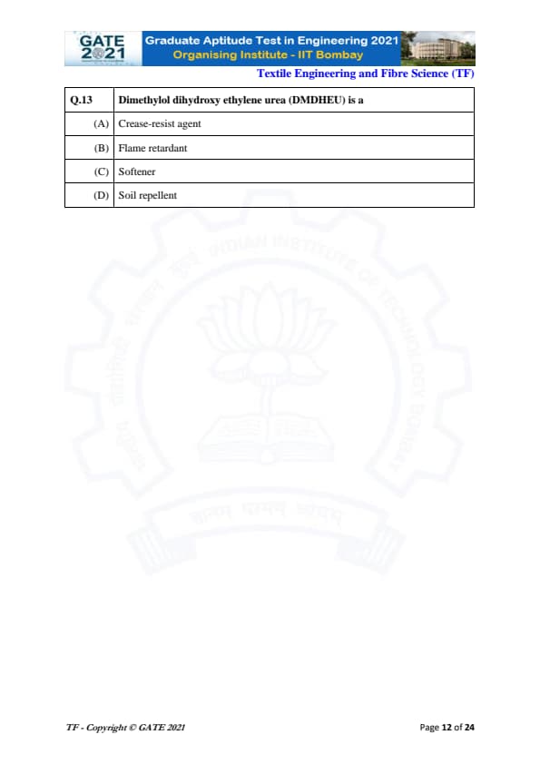 | GATE 2021 Textile Engineering and Fiber Science (TF) Question Paper | Check Solutions |