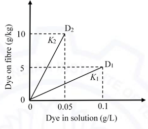 From the graph, the partition coefficient \( K \) is given by the ratio of dye concentration on the fibre to the concentration in solution. For dye \( D_1 \), the ratio \( K_1 \) is given by: \[ K_1 = \frac{Dye on fibre}{Dye in solution}. \]