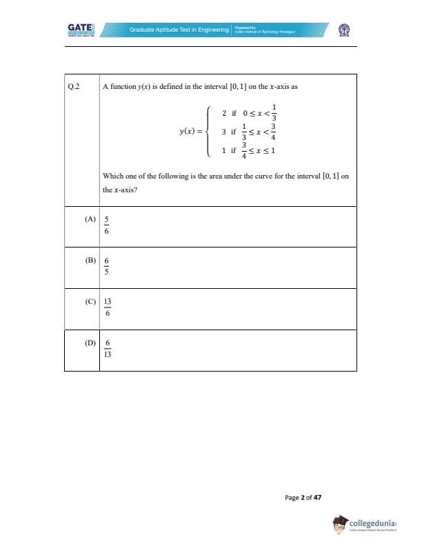 Thus, the correct answer is (C). Quick Tip: When calculating the area under a piecewise function, break it into intervals and calculate the area for each segment separately.