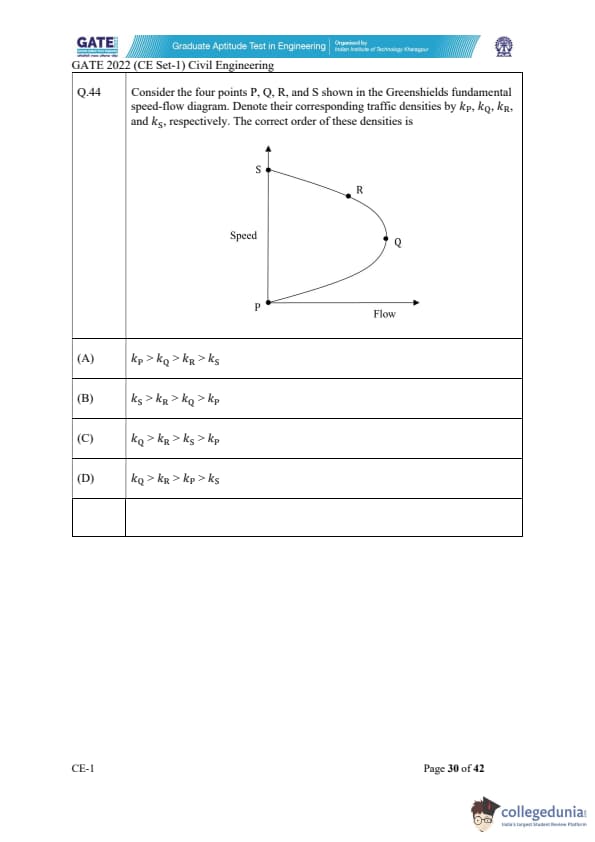 Consider the four points P, Q, R, and S shown in the Greenshields fundamental speed-flow diagram. Denote their corresponding traffic densities by \( k_P \), \( k_Q \), \( k_R \), and \( k_S \), respectively. The correct order of these densities is: