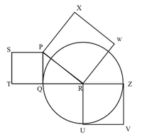 In the following diagram, the point R is the center of the circle. The lines PQ and ZV are tangential to the circle. The relation among the areas of the squares, PXWR, RUVZ and SPQT is