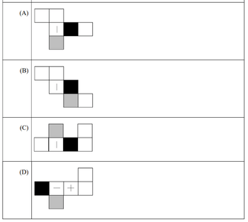 Consider a cube made by folding a single sheet of paper of appropriate shape. The interior faces of the cube are all blank. However, the exterior faces that are not visible in the above view may not be blank. Which one of the following represents a possible unfolding of the cube?