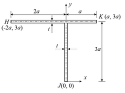 Consider the cross-section of a beam made up of thin uniform elements having thickness \( t \) (where \( t \ll a \)) shown in the figure. The (x, y) coordinates of the points along the center-line of the cross-section are given in the figure.