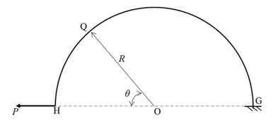 A semi-circular bar of radius R m, in a vertical plane, is fixed at the end G, as shown in the figure. A horizontal load of magnitude P kN is applied at the end H. The magnitude of the axial force, shear force, and bending moment at point Q for \(\theta = 45^\circ\), respectively, are