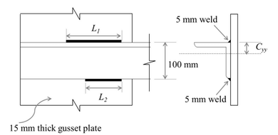 A weld is used for joining an angle section ISA 100 mm \(\times\) 100 mm \(\times\) 10 mm to a gusset plate of thickness 15 mm to transmit a tensile load. The permissible stress in the angle is 150 MPa and the permissible shear stress on the section through the throat of the fillet weld is 108 MPa. The location of the centroid of the angle is represented by \( C_{yy} \) in the figure, where \( C_{yy} = 28.4 \, mm \). The area of cross-section of the angle is 1903 mm\(^2\). Assuming the effective throat thickness of the weld to be 0.7 times the given weld size, the lengths \( L_1 \) and \( L_2 \) (rounded off to the nearest integer) of the weld required to transmit a load equal to the full strength of the tension member are, respectively