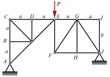 The plane truss shown in the figure is subjected to an external force \( P \). It is given that \( P = 70 \, kN \), \( a = 2 \, m \), and \( b = 3 \, m \).