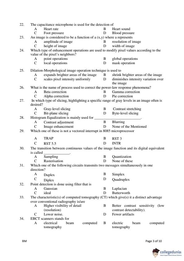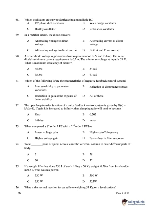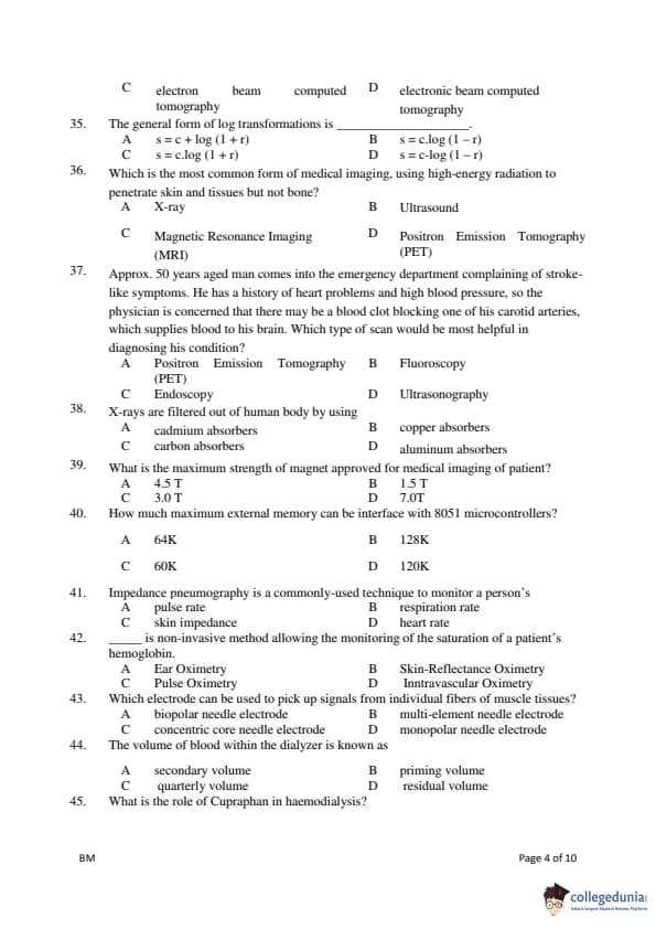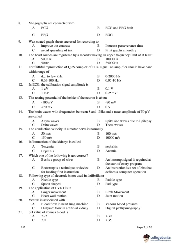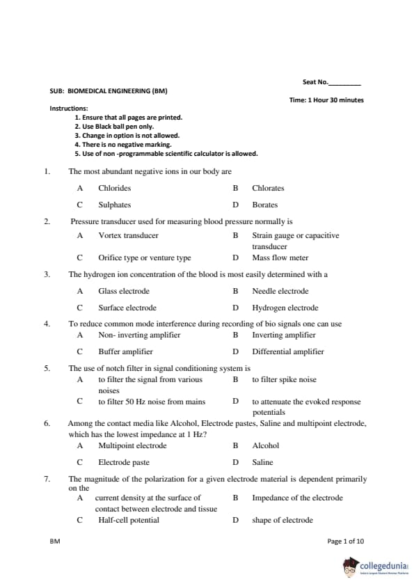 Gujarat PGECET 2018 BIOMEDICAL ENGINEERING (BM) Question Paper with Answer Key PDFs (July 14)