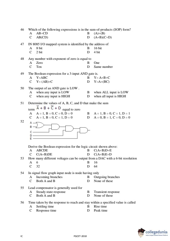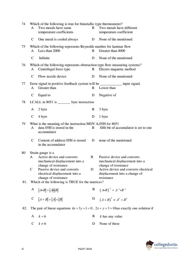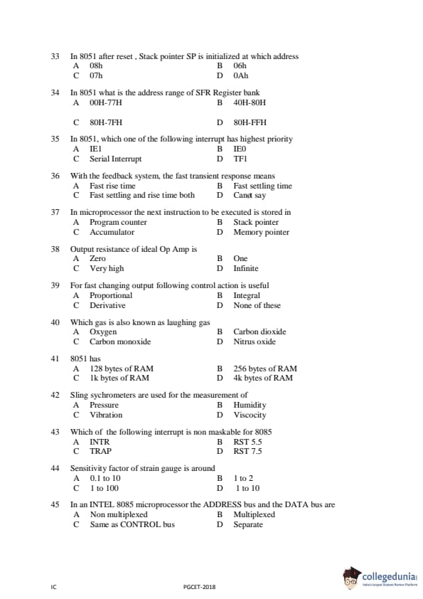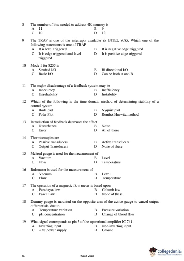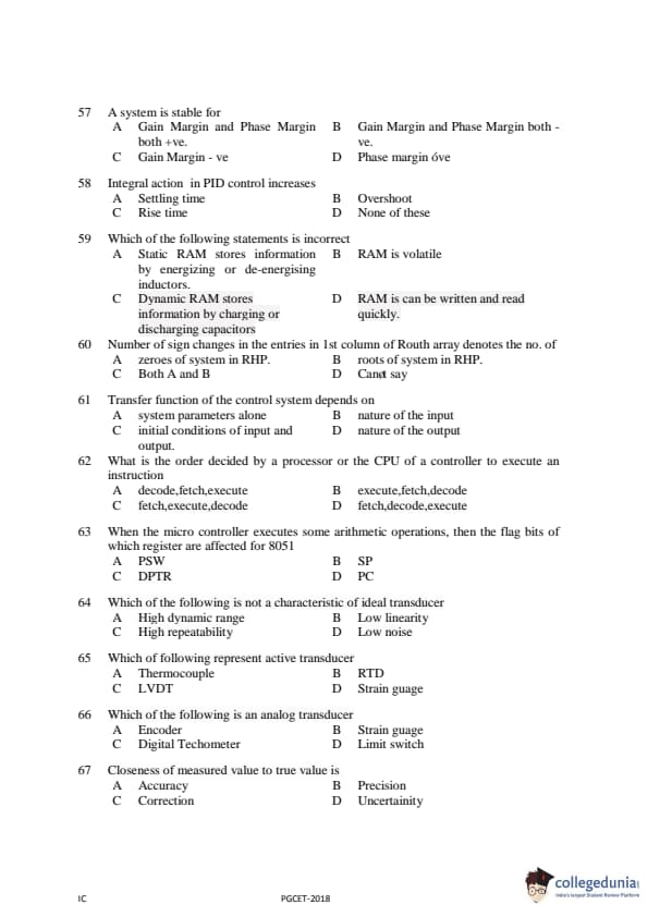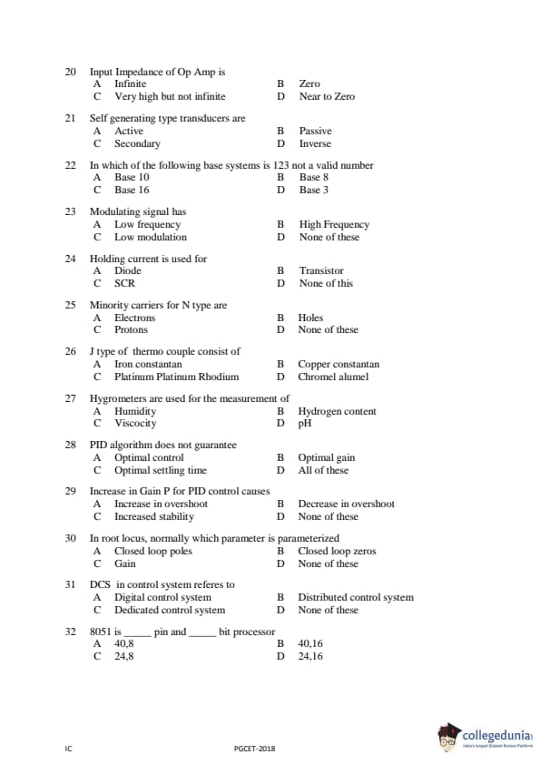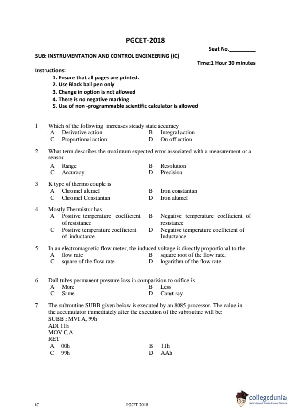 Gujarat PGECET 2018 INSTRUMENTATION & CONTROL ENGINEERING (IC) Question paper with answer key pdf conducted on July 15, 2018 is available for download. The exam was successfully organized by Admission Committee for Professional Courses (ACPC). The question paper comprised a total of 100 questions.