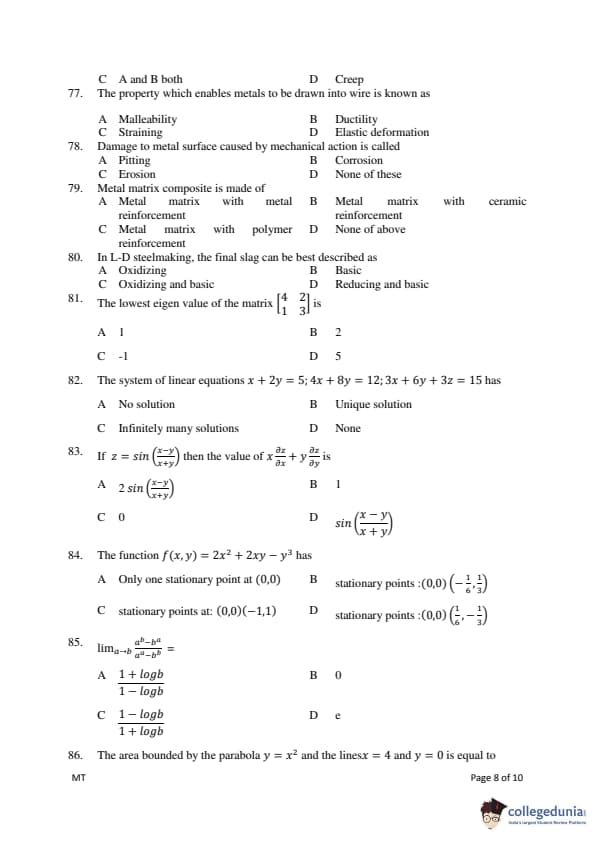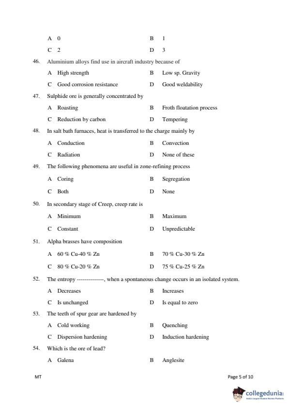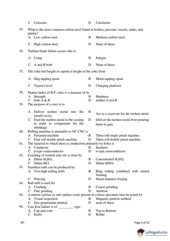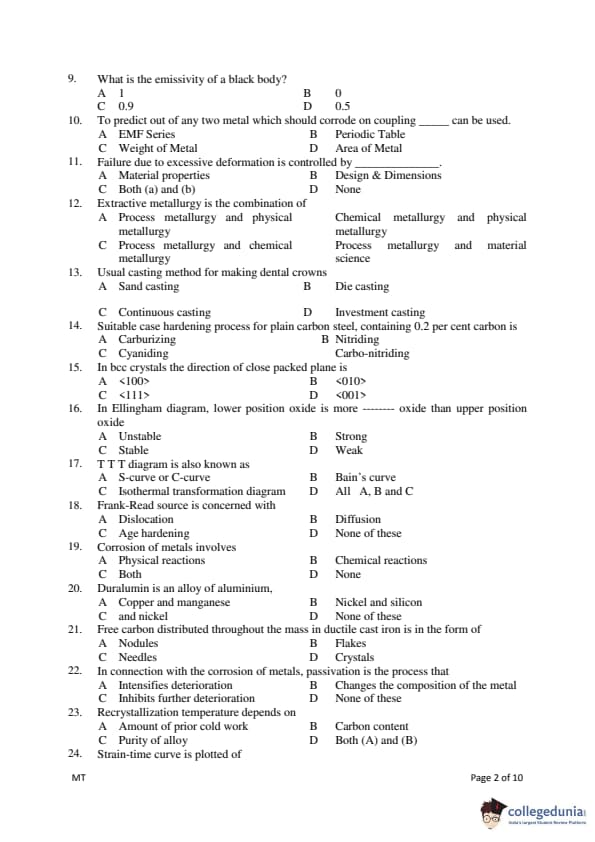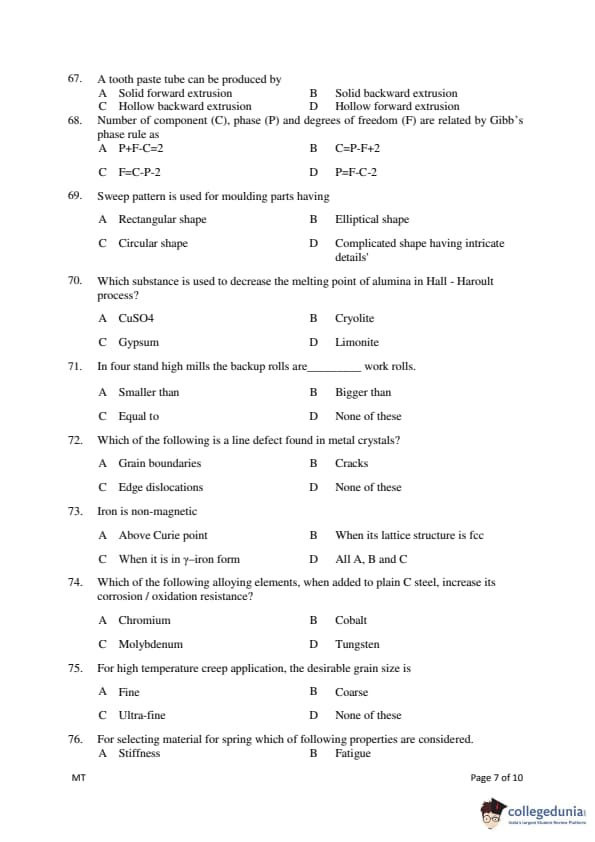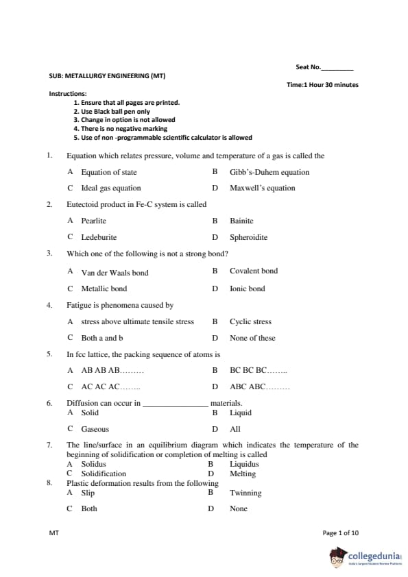 Gujarat PGECET 2018 METALLURGY ENGINEERING (MT) Question Paper with Answer Key PDFs