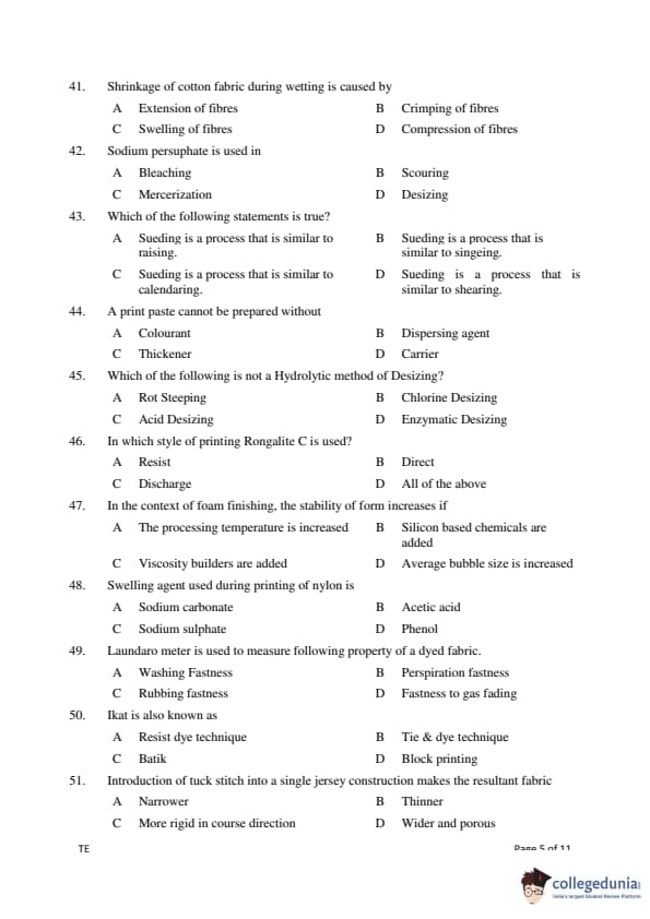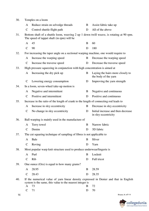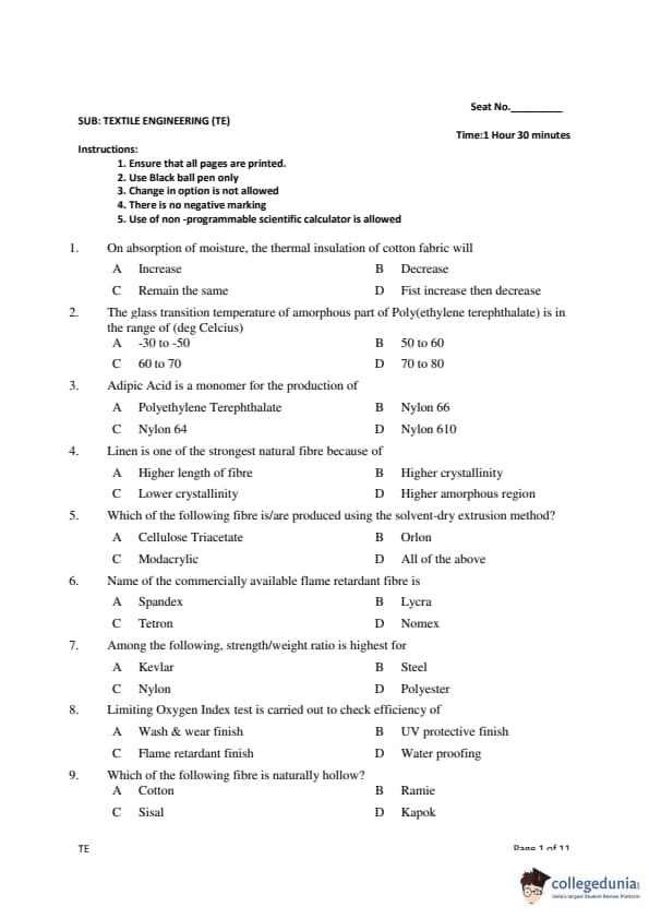 Gujarat PGECET 2018 TEXTILE ENGINEERING (TE) Question paper with answer key pdf conducted on July 15, 2018 is available for download. The exam was successfully organized by Admission Committee for Professional Courses (ACPC). The question paper comprised a total of 100 questions.
