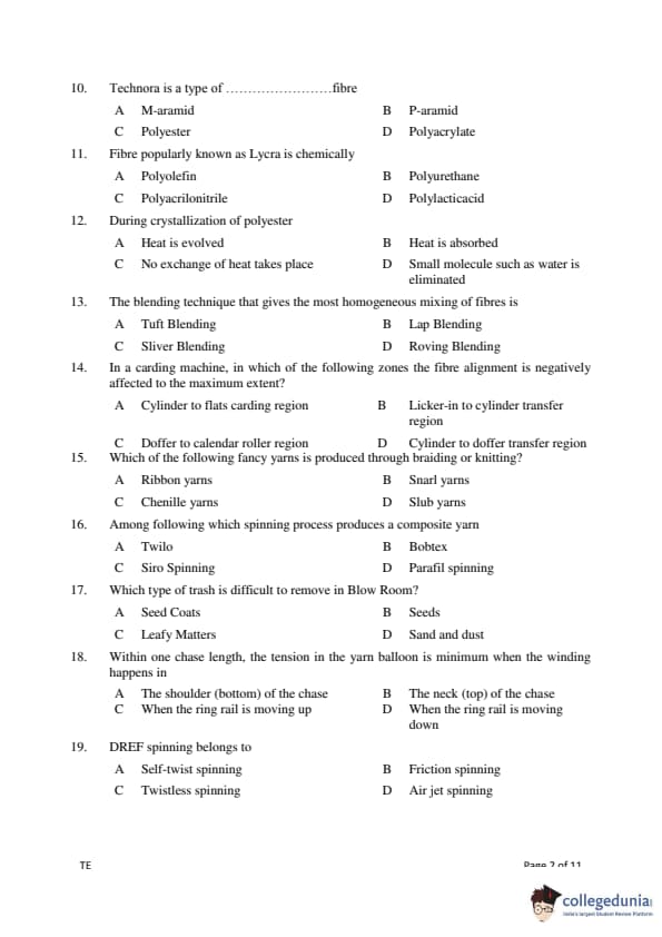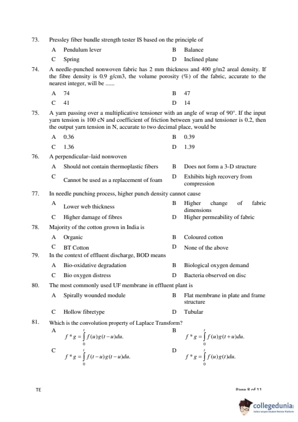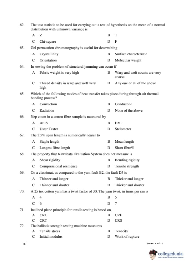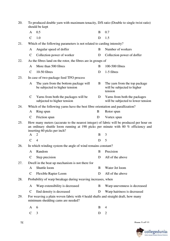 Gujarat PGECET 2018 TEXTILE ENGINEERING (TE) Question Paper with Answer Key PDFs (July 15)