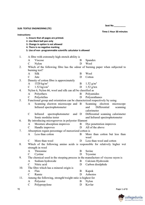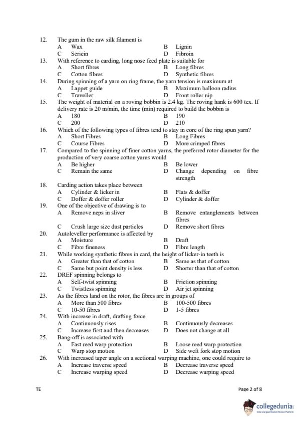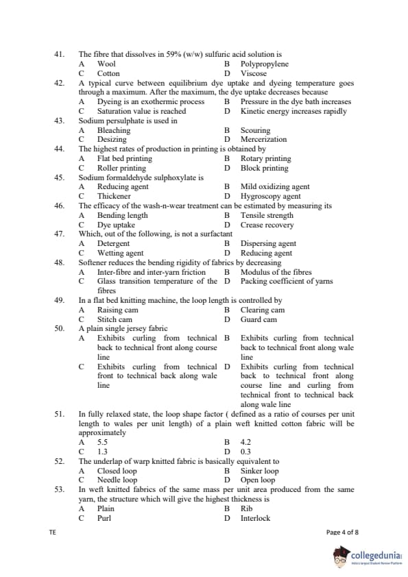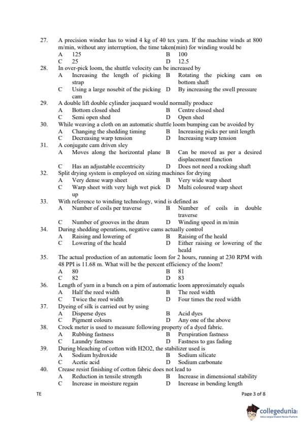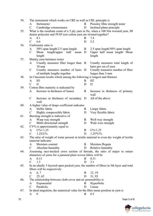 Gujarat PGECET 2019 TEXTILE ENGINEERING (TE) Question paper with answer key pdf conducted on July 13, 2019 is available for download. The exam was successfully organized by Admission Committee for Professional Courses (ACPC). The question paper comprised a total of 100 questions.