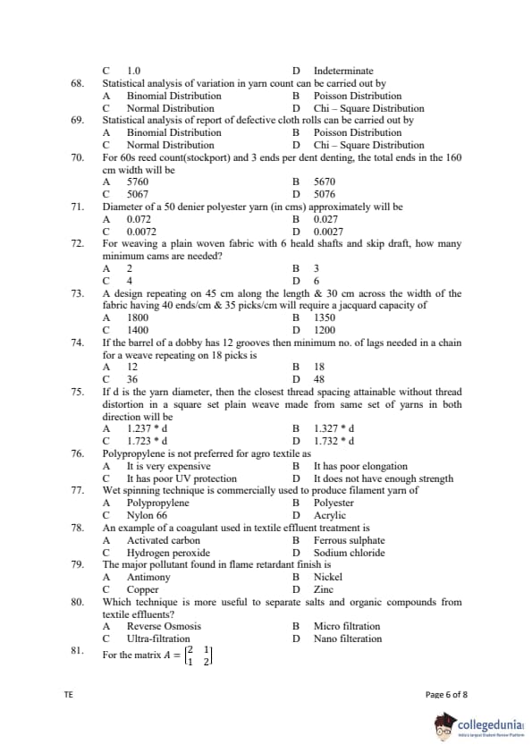 Gujarat PGECET 2019 TEXTILE ENGINEERING (TE) Question Paper with Answer Key PDFs