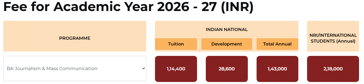 Earlier, BAJMC Journalism and Mass Communication fees at NCU was ₹ 4.32 Lakhs (in 2025) for the entire course duration. This shows a fee increase of ₹ 9,440 over the year.