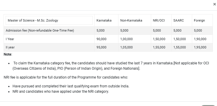 For students applying under the NRI quota for admission, the total course fee for M.Sc Zoology at SJU Bangalore is ₹ 3.05 Lakhs.